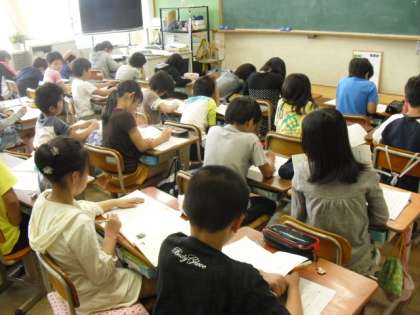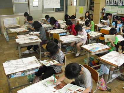 前の授業で描いた下書きの絵に色を塗り始めました。