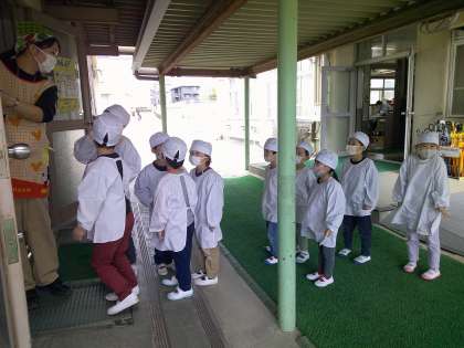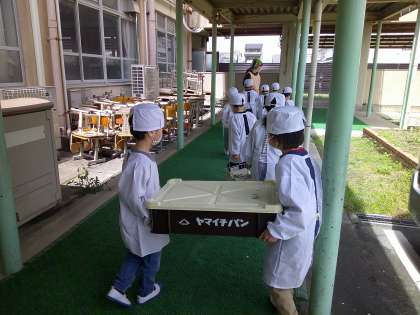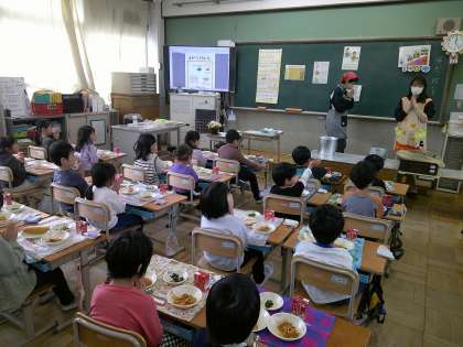 1年生の子どもたちは、エプロンを着て、給食当番もしました。