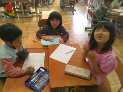 1年生との学校探検に向けて話し合っています。