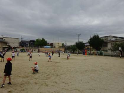 登校後、グラウンドでは、子どもたちが元気に遊んでいます。