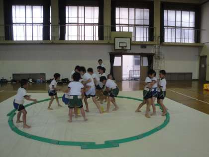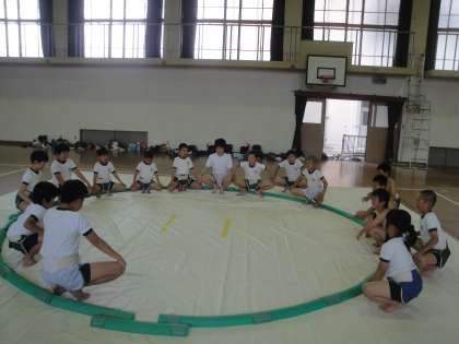 四股やすり足などの基本動作や所作などを確かめ,最後はゲームをして楽しみました。