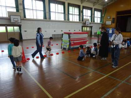 道路を横断するときのルールを学び、実際に、道路に見立てた、コースを歩いています。