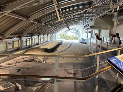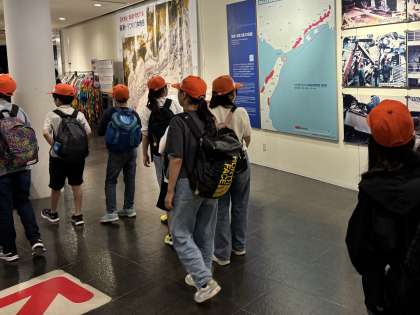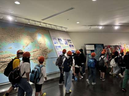 館内はビデオを見るグループと見学をするグループの2つに分かれて活動を始めています。こちらのグループでは展示を見学します。実際の地震の断層も展示されています。