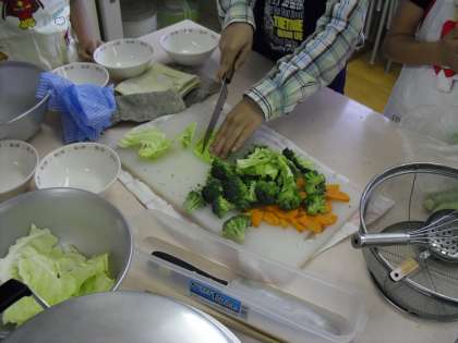 キャベツ・にんじん・ブロッコリーを使ったゆで野菜のサラダとドレッシングを作りました。調理実習では初めて使う包丁に少しドキドキしている人もいましたが,グループで協力しながら安全に,おいしく,楽しく作ることができました。
