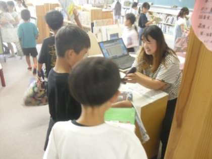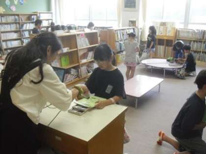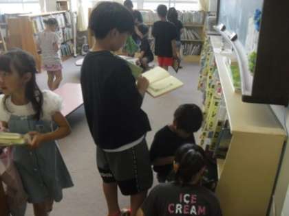 図書室で本を借りてました。自分の興味に合った本を2冊選び、読書への意欲を高めています。