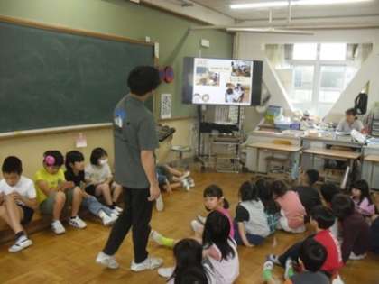 育成学級の担任が育成学級についてわかりやすく説明し、1年生たちは真剣に耳を傾けていました。