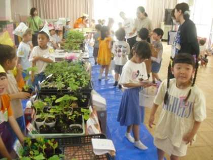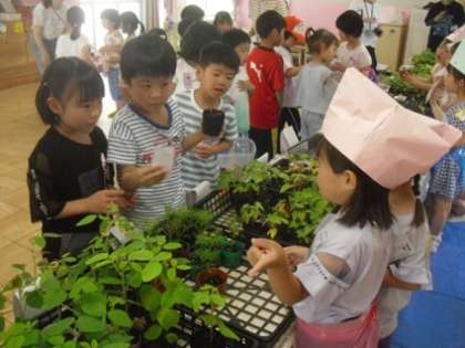 園児たちは苗屋さんの店員になりきり、「いらっしゃいませ!」と元気に声をかけながら、苗の説明やお金のやりとりを楽しんでいました。