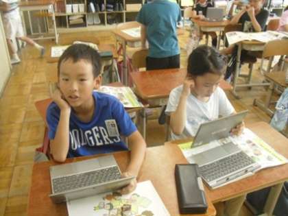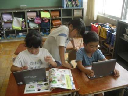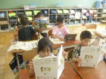 図書室で本を読んている子や教室でGIGA端末や教科書を使っている子など、いろいろな方法で情報を集めている姿が見られました。