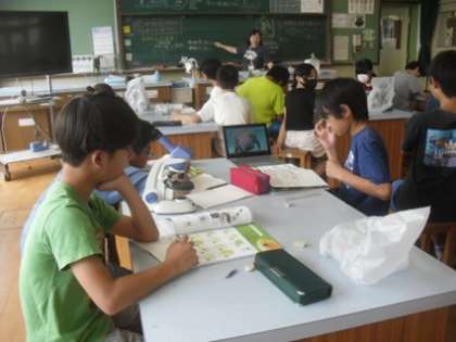池や小川にいるメダカは何を食べているのか、予想を立てて調べています。