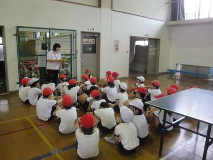 卓球台の置き方など話をしっかりと聞き,初めてラケットをもって活動しました。