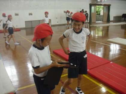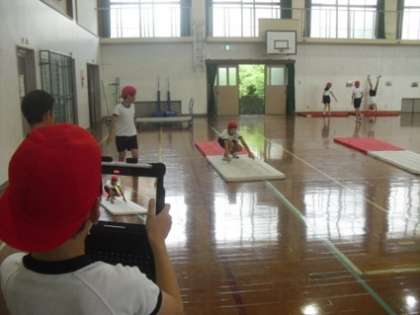 iPadを使って技の様子を撮影し、互いに見合いながら改善点を話し合うなど、主体的に学習を進める姿が見られました。