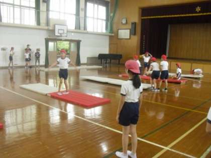 マット運動の学習では、めあてに合った場で技の練習に取り組んでいます。
