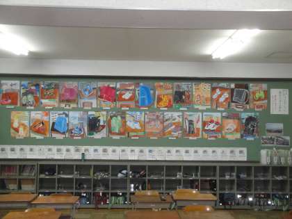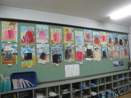 教室には,「ぼくのわたしのランドセル・くつと教室から見える風景」というタイトルの絵を掲示しています。