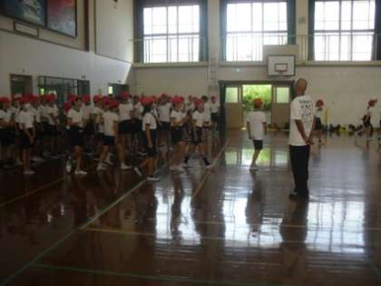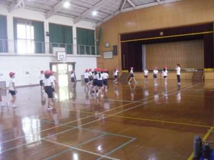 運動場では2年生が、体育館では6年生が運動会に向けて練習をしていました。