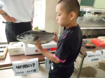 6年生はその後,魚の生産,流通等についての学習会が行われます。本日は6年2組が「調理実習」で1人1匹サバを3枚におろします。