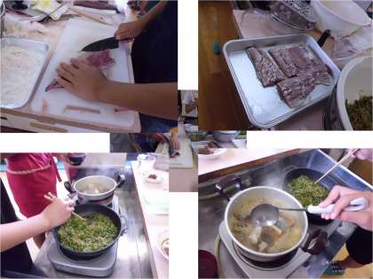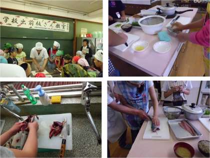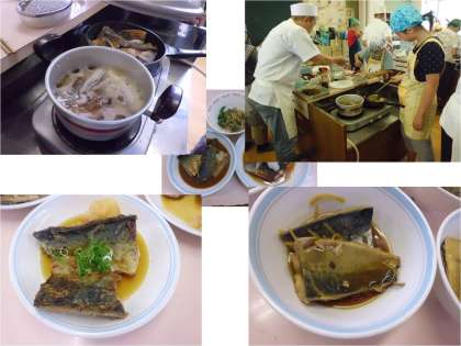 調理実習が始まりました。プロの料理人の指導のもと,サバを3枚におろし,サバの味噌煮,サバの佑庵焼き,万願寺唐辛子とちりめんじゃこの炒め物を作ります。どんな出来上がりになるでしょう。