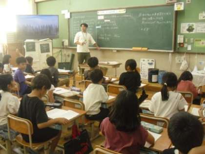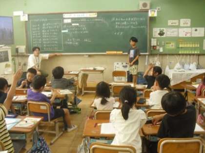 「4ミリの本を8冊積むと、どれだけの高さになるのか?」を考えながら、かけ算の意味について話し合いました。