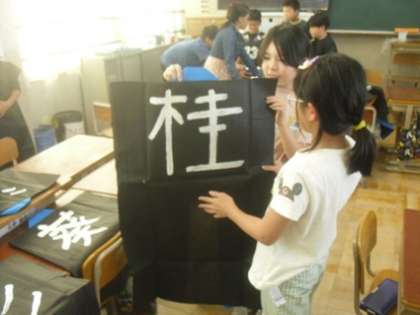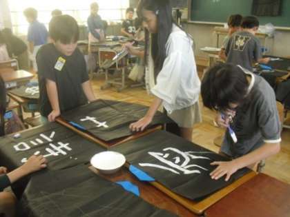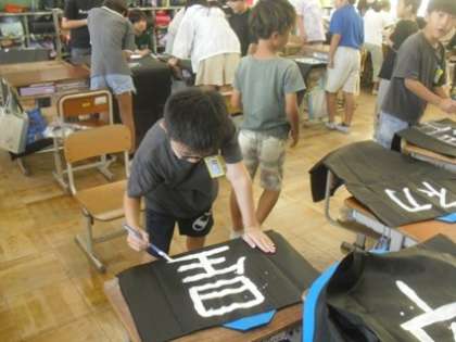 運動会で着る法被に、自分の好きな漢字を1文字、丁寧に書いていました。