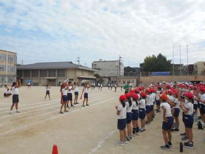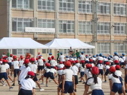 全校体操・たてわり競技(玉送り)・応援練習を行い、