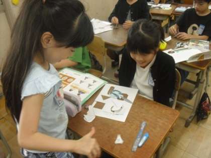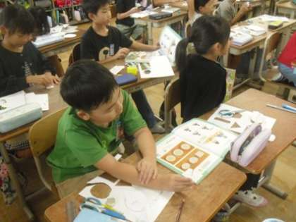 円の大きさや位置の違いに気づき、発表し合っています。