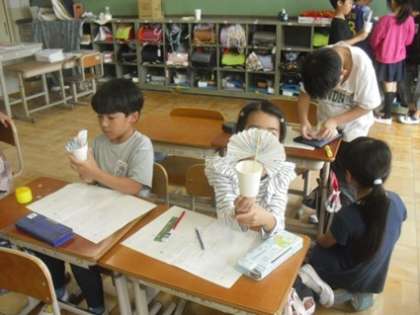 「紙コップ花火の作り方」という説明文を読み、文章がどのようなまとまりで構成されているかを確かめながら、実際に紙コップ花火を作る活動を行っています。