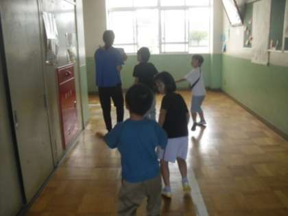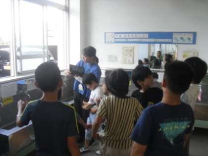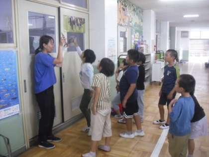 担任が示す写真を見てその場所へ行き、そこで行われている学習内容などを調べています。