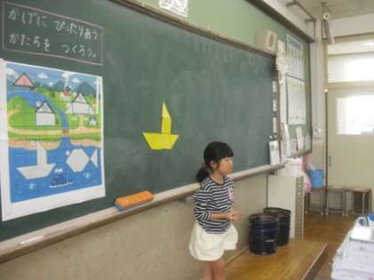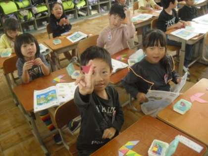 三角の色板を使って、教科書に載っている図と同じ形を作る活動をしました。