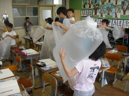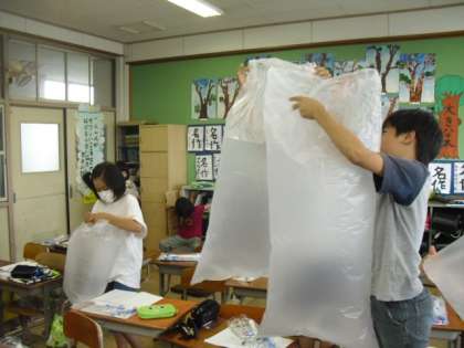 袋に空気を閉じ込めて、どんな感じがするのか実験しました。