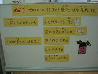 6月の身体計測も終わりました。ミニ保健指導では「つめのはなし」をしました。動物の爪の写真から,その動物を考えたり,爪の役割を知ったりしました。その後,人間の爪の役割についても考えました。