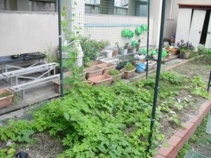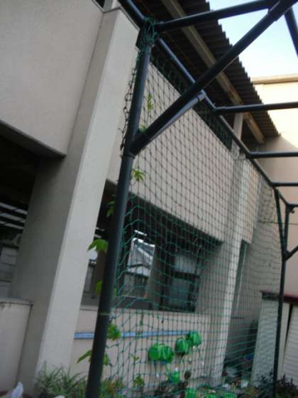 学校園のツルレイシはうだるような暑さにも負けず、成長を続けています。