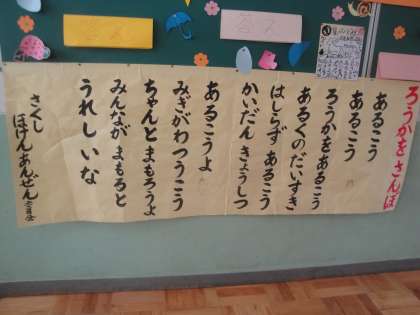 昇降口前の掲示板には,保健安全委員会作成の「ろうかをさんぽ」の歌詞が掲示してあります。
