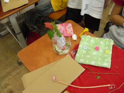 木切れやペットボトル、カップなど家にあったものを使って、自分の作りたい世界を表現しています。