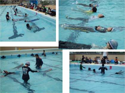 伏見消防署の方にご来校いただき「着衣泳」のご指導をいただきました。服を着たまま水中で歩くこと,泳ぐことの困難さや厳しさを体験しました。次に浮き具を利用した背浮きの練習をしました。靴は浮きやすいことから,浮き具なしでの背浮きの仕方を教えていただきました。伏見消防署警防課第1部の皆様,本当にありがとうございました。