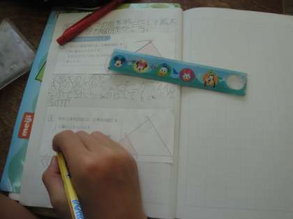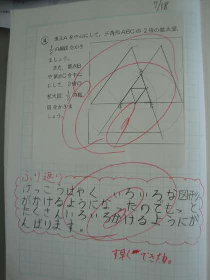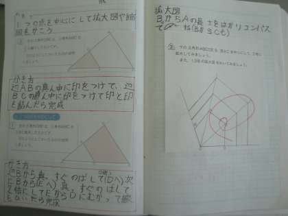 1つの頂点を中心として,三角形や四角形の拡大図・縮図を作図する方法を考え,説明しました。