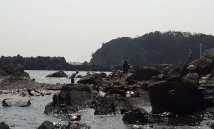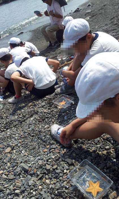 磯観察中です。マリンランドの職員さんに,ヒトデの生態や磯観察で見つけた生き物のことを教えてもらっています。