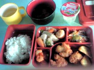夕食です。久しぶりのお味噌汁が大人気でした。本日3回目のお弁当をよく食べています。