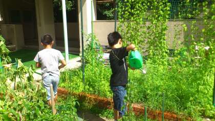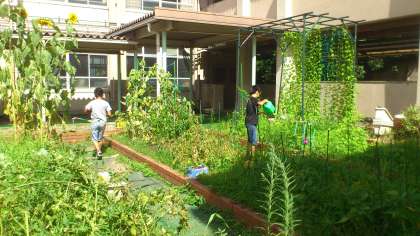 4年生では夏休みの水やり当番を決めて、ツルレイシに水やりをしています。