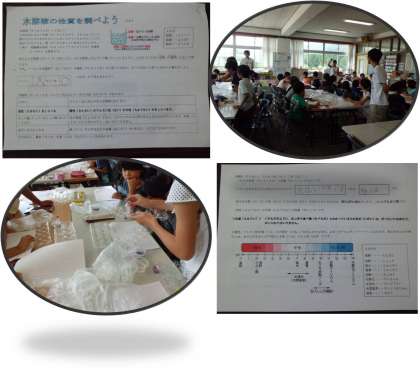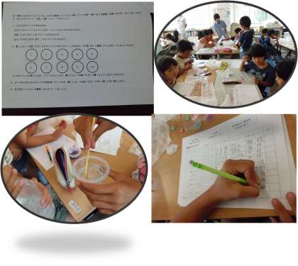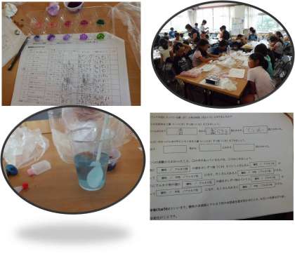 低学年の子どもたちも6年生に教えてもらいながら一生懸命に取り組んでいます。いろいろな水溶液の色が変化していく様子におどろいていました。