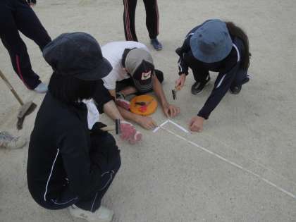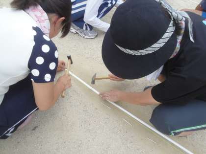 今日は,ラインテープを新しく貼りました。角度と長さを測り,ひもをぴんと伸ばして釘を打ちつけていきました。