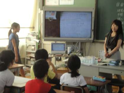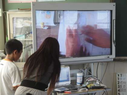 実物投影機でテレビ画面に映したり,作品を見せながら説明したりする姿が見られました。