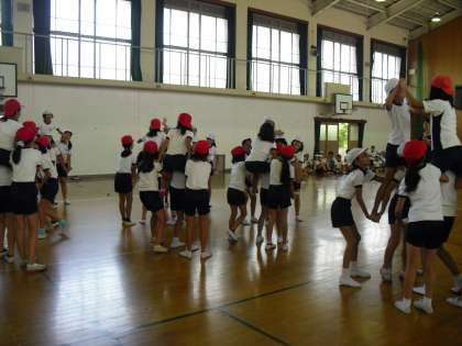 運動会で行う騎馬戦の練習をはじめました。はじめに騎馬の組み方や注意を確認し,実際に騎馬を組んで動く練習をしました。