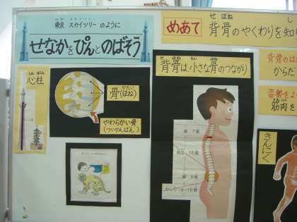 9月から3回シリーズで,「姿勢」について取り組んでいます。夏休みに見た「東京スカイツリー」と「人間の背骨」の仕組みを対比させながらすすめていきました。自分の背骨を触って確かめて,背骨が前にも後ろにも…自由に動かせるのは,背骨の一つ一つの骨の間にある「やわらかい骨(椎間板)」の働きによることなどを学んでいきました。「人間の体って,うまくできているなぁ!」と思ってくれたらしめたものです。