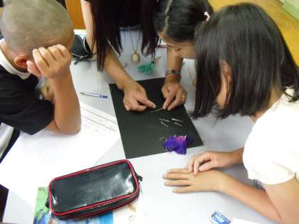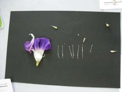 アサガオの花がどのようなつくりになっているのかを調べました。花弁や額を丁寧に取り除き,おしべやめしべを取り出して顕微鏡で観察しました。初めて見るおしべやめしべには,たくさんの発見があったようです。