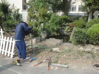 管理用務員さんが池周辺から玄関にかけて,樹木の剪定を中心に環境整備をしてくださいました。普段見落としがちなところまで,子どもたちのために気を配っていただいています。