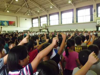 本日児童朝会が行われました。22日(土)に向けて,全校で「運動会の歌」や「校歌」の練習をしました。児童みんなが気持ちを込めて歌えると盛り上がるでしょう。その後,各委員会からのお知らせがありました。