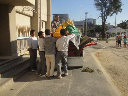 午後4時前。地域の方と伏見中学校の生徒と協力し,御香宮へマットと相撲マットを運びました。