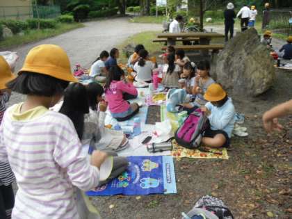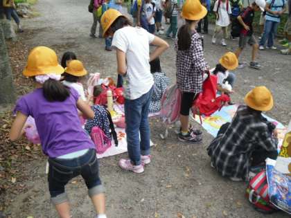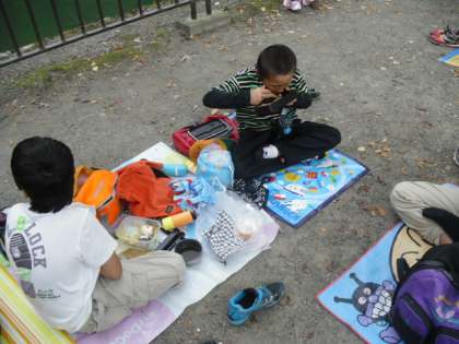 友達同士、シートをくっつけて楽しくお弁当を食べていました。