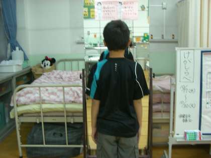 また,姿勢用の特別な鏡(縦と横に罫線が入っています)を購入してもらいました。そこで,身体計測前や視力検査前には「姿勢チェック」をしています。自分の姿勢のくせに気がついて,よい姿勢のためにどうしたらいいのかに気付いてほしいと思っています。ご家庭でも鉛筆の持ち方と合わせて姿勢についての声かけをお願いします。
