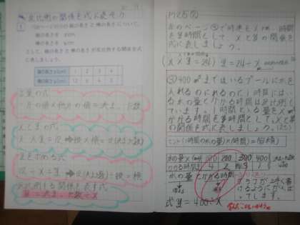 表から2つの数量の関係を見いだし,反比例の式に表しました。