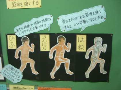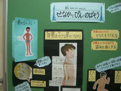 11月の身体計測をしています。保健指導は,9月に引き続き「せなかをぴんとのばそう」の2回目です。子どもたちはからだの話を一生懸命聞いてくれていますが,一度聞いただけでは,記憶に残らないことも多いです。そこで,9月の話の内容を思い出すために,保健室前に掲示しています。11月の保健指導の話の後,9月の内容を思い出して,知識を積み上げてくれることを願っています。